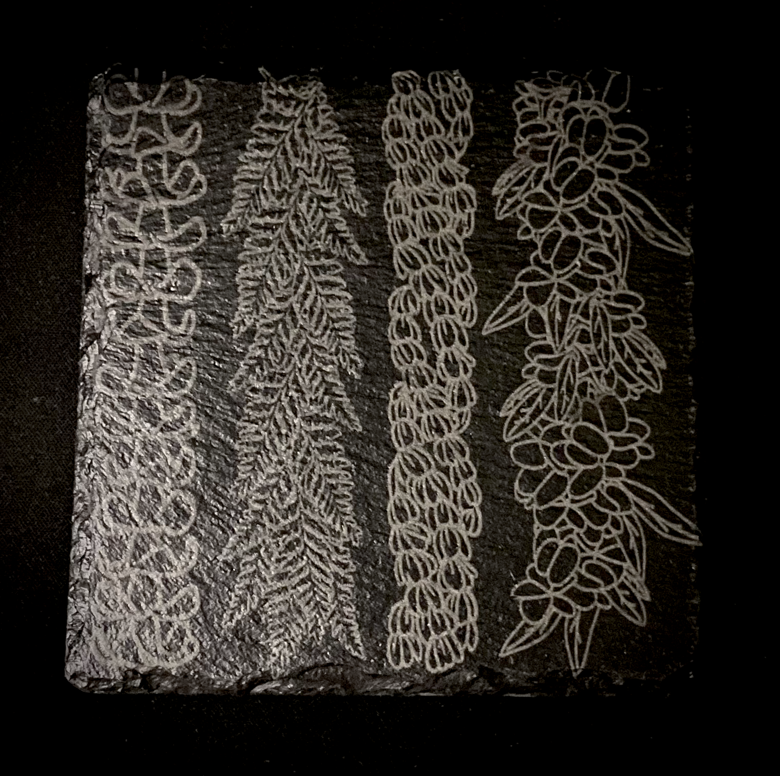 Celebrate the beauty of lei in this laser etched slate coaster. Embrace the glory of lei pua kenikeni, lei palapalai, lei pikake, and lei ʻaʻaliʻi.